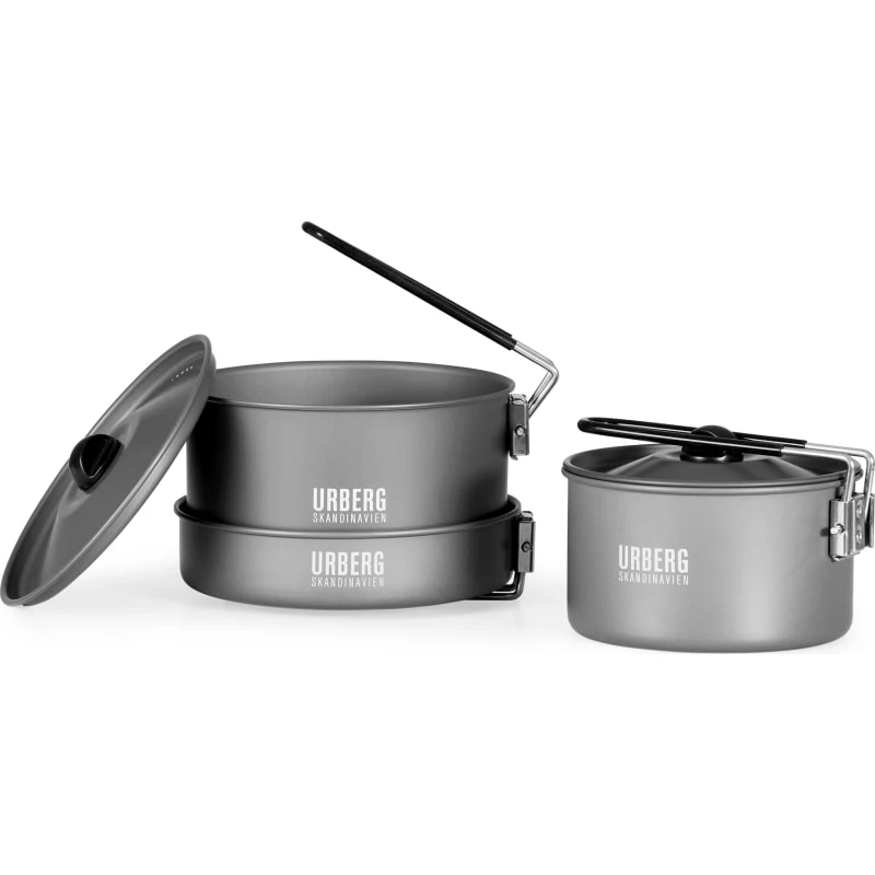 Rogen Cookset 2P fra Urberg er et praktisk sett med to panner, to lokk og en stekepanne som passer til middag i naturen.
